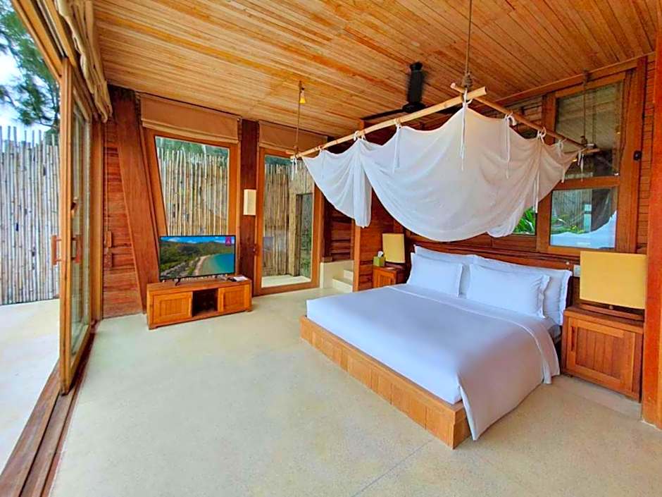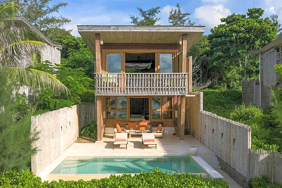 This beachfront, two-story villa consists of of a bedroom, private infinity pool, and offers panoramic views of the ocean. You will find a bathroom on the ground floor, which equips with a bathtub, an outdoor shower, and double vanity basins.