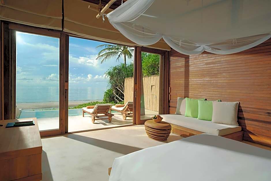 This beachfront offers direct access to the beach and ocean views. It also has a private pool, terrace, and sun loungers. Private bathroom comes with double vanity basins, a bathtub, and an outdoor shower.